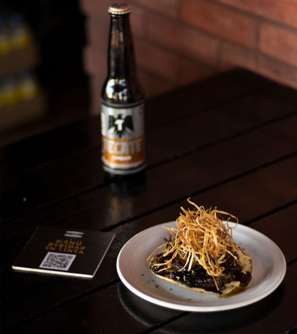 Corn tortilla with bacon wrapped shrimps, american cheese, jalapeño, and thin layer of refried beans with our chipotle dressing from the house.